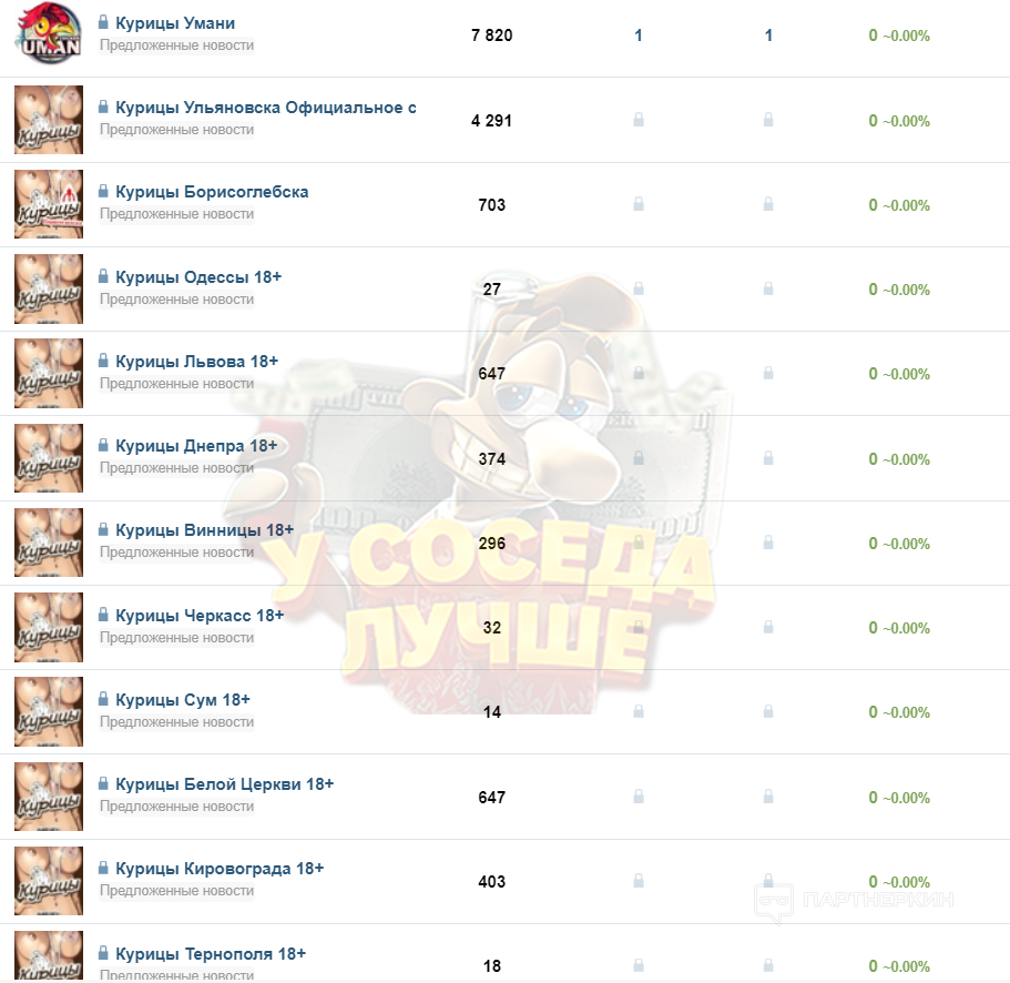 Автор кейса создает региональные закрытые паблики под названием Подслушано, Курицы и так далее с припиской к определенному городу.